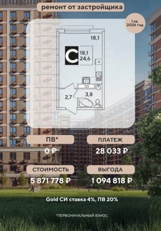 Уже через год готовая студия 26,9 м2 будет Ваша.